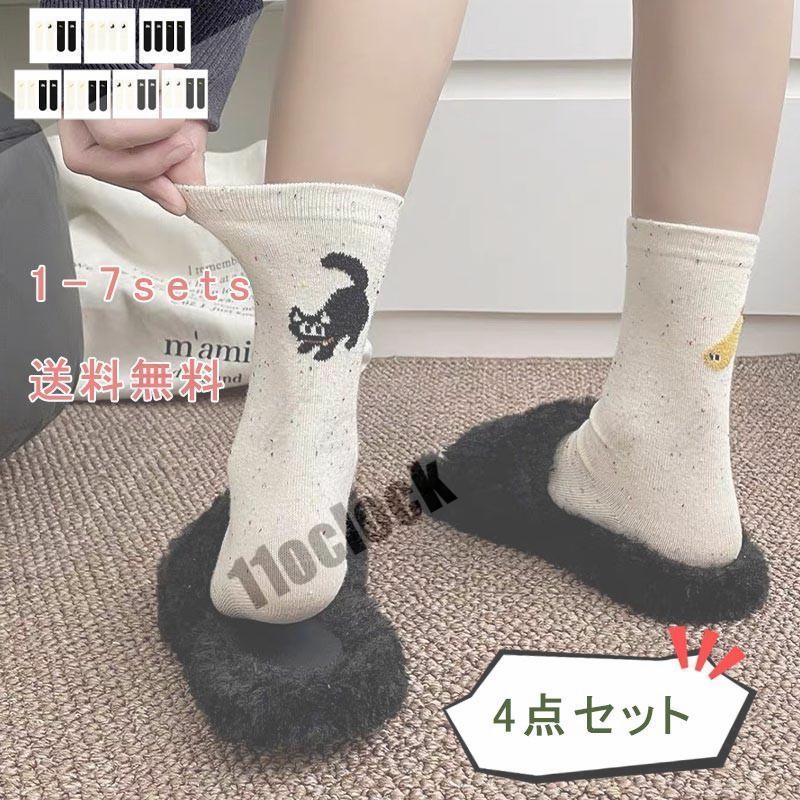 靴下 4足セット 猫 魚 レディース ソックス くつした カジュアル 春夏秋冬 おしゃれ かわいい 保温 蒸れない 暖かい 冷え対策 ゆったり ずり落ち抑制
