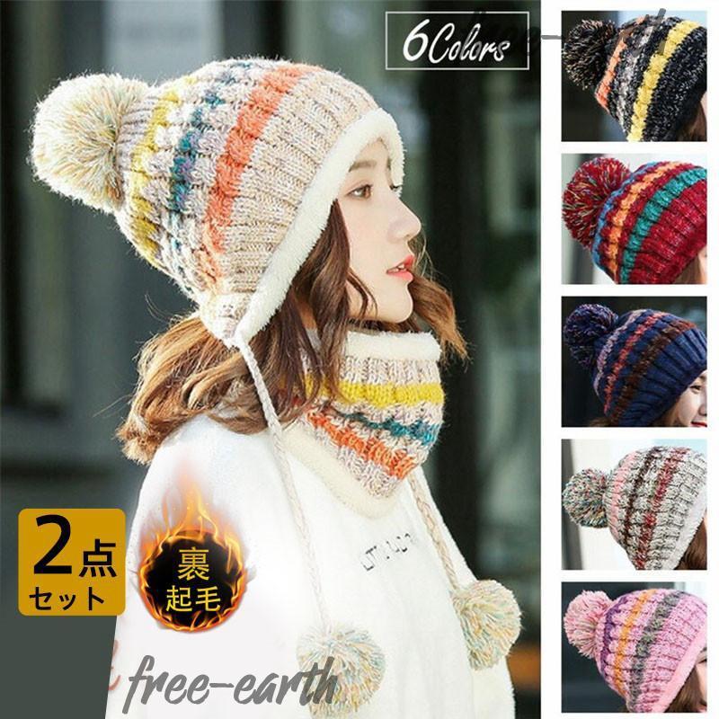 ニット帽 レディース ニットキャップ スヌード 2点セット ネックウォーマー ポンポン ボーダー 裏起毛 防風 防寒 可愛い バイク 秋冬 送料無料