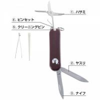 機能:1.ハサミ、2.ヤスリ、3.ナイフ、4.ピンセット、5.クリーニングピン
