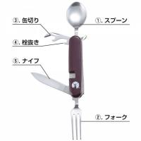 機能:1.スプーン、2.フォーク、3.缶切り、4.栓抜き、5.ナイフ