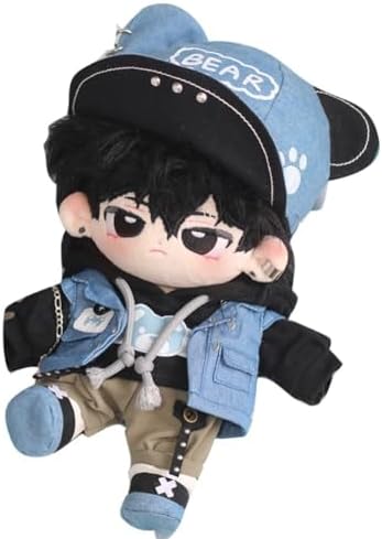 概要説明:20cmサイズのぬいぐるみ用にデザインされたクール系カジュアルファッションの5点セット。黒パーカー、デニムベスト、パンク風パンツ、キャンバススニーカー、帽子が含まれ、手作りで丁寧に仕上げられています。