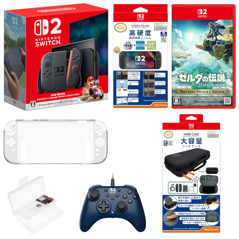 Switch2本体マリカセット+ゼルダティアーズ+スクリーンガード9H高硬度+ハードケース+カードケース24+プロテクトカバーセパレート+ホリパッドTURBO