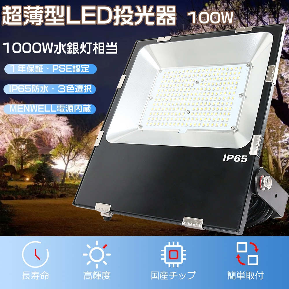 LED投光器 薄型 投光器LED 100W LED投光器 屋外用 100W LED作業灯 防水 ワークライト 100W 1000W水銀灯相当 20000lm 工場の照明器具 舞台照明 看板灯LED