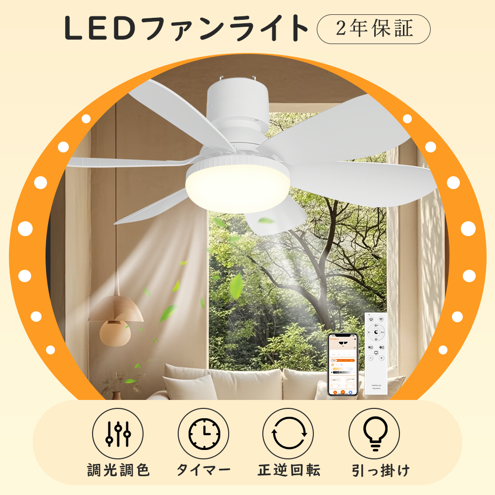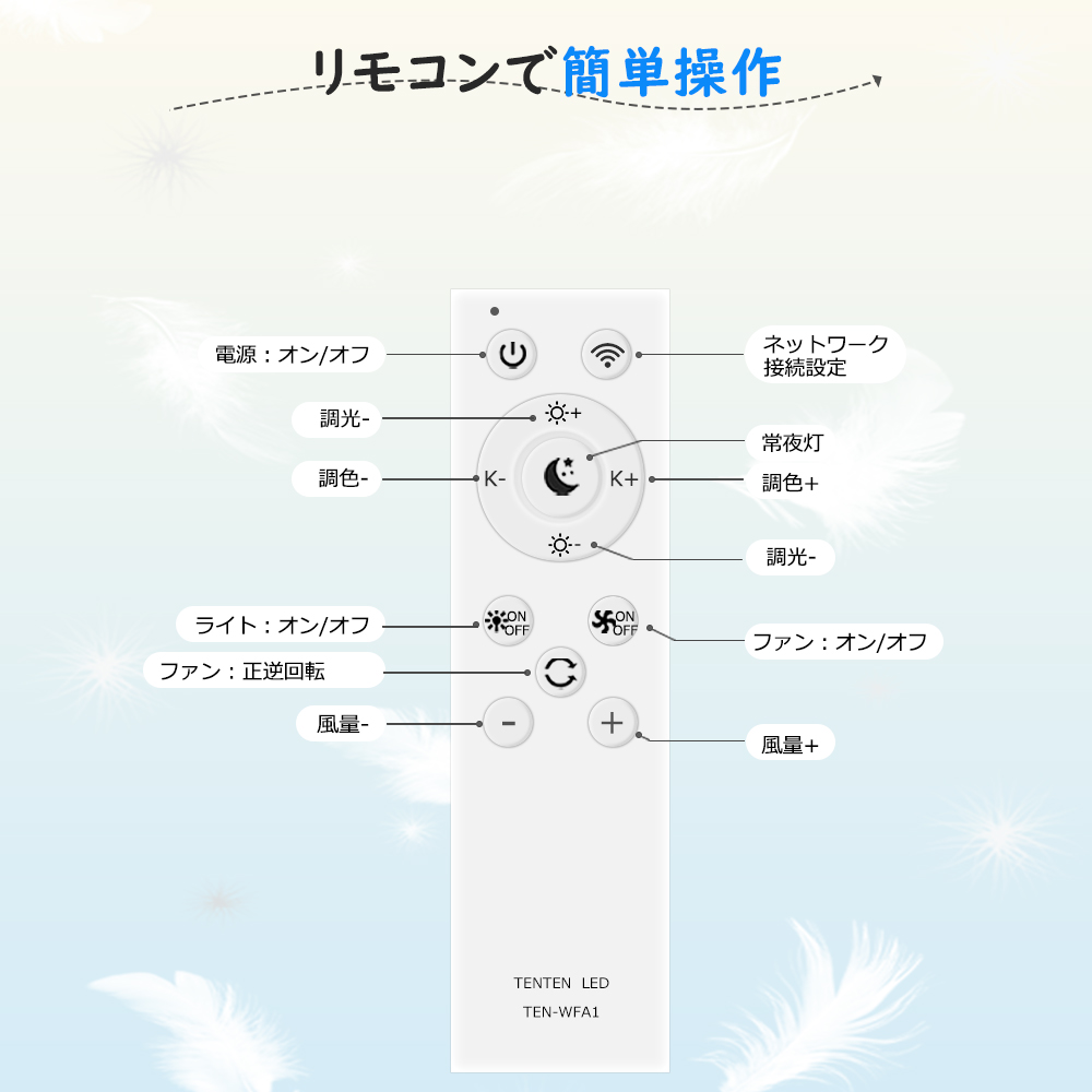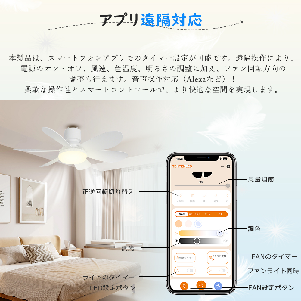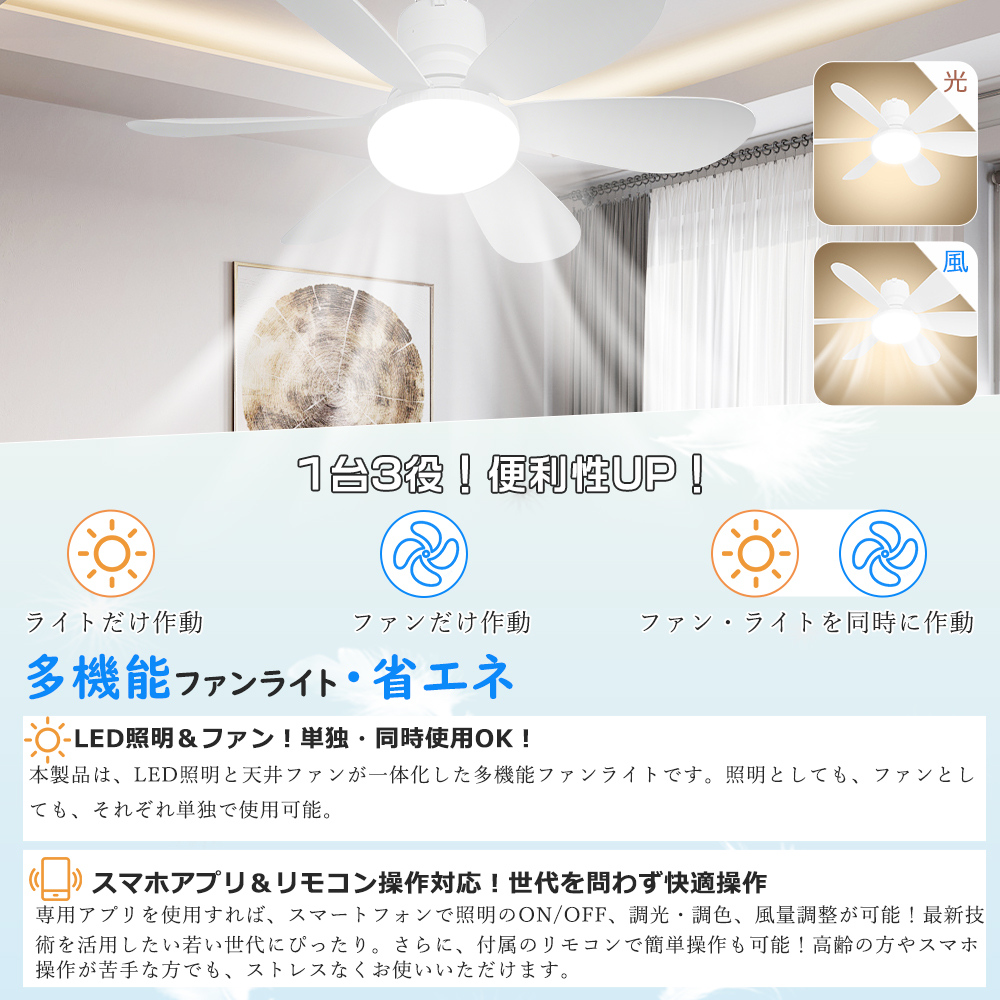 | ■【スマホアプリ&リモコン操作対応!】 | 世代を問わず、快適操作専用アプリを使用すれば、スマートフォンで照明のON/OFF、調光・調色、風量調整が可能!最新技術を活用したい若い世代にぴったり。 さらに、付属のリモコンで簡単操作も可能!高齢の方やスマホ操作が苦手な方でも、ストレスなくお使いいただけます。非常時は停電対策にもなります。屋外、キャンプなどで活躍してくれます。 |