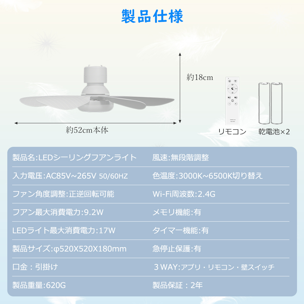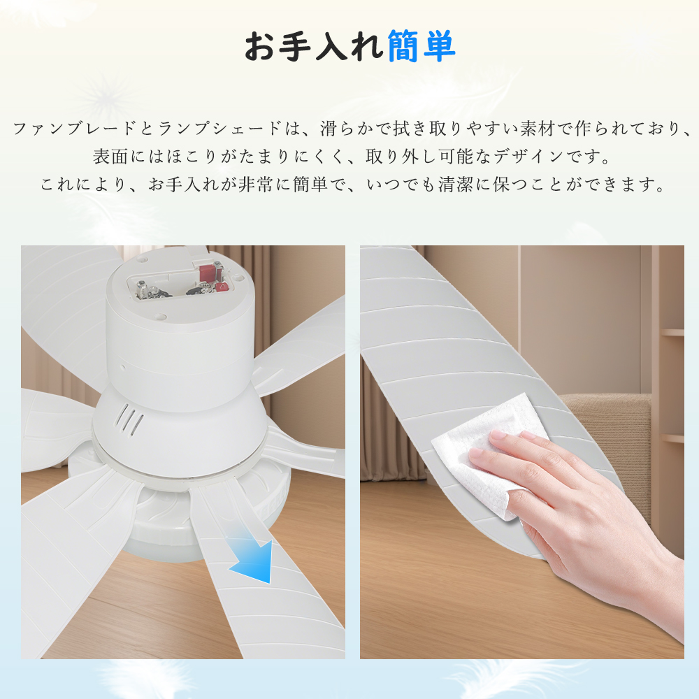 | ■【お手入れ簡単】 | ファンブレードとランプシェードは、滑らかで拭き取りやすい素材で作られており、表面にはほこりがたまりにくく、取り外し可能なデザインです。これにより、お手入れが非常に簡単で、いつでも清潔に保つことができます。 |