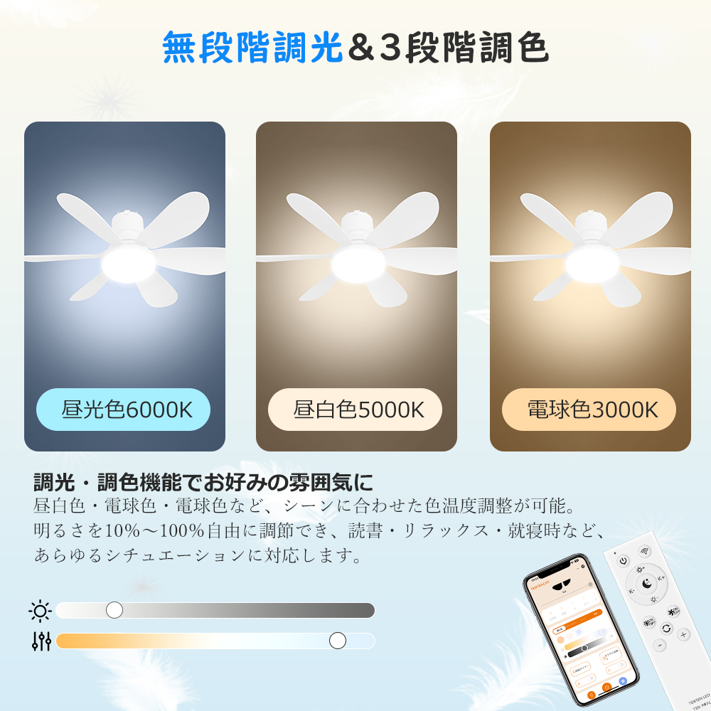 | ■【無段階調光&風量調節】 | スマホアプリ&リモコンで簡単に調光・調色可能。昼光色・昼白色・電球色の3色を10%〜100%まで無段階で切り替え。風量も自由に調節可能! |