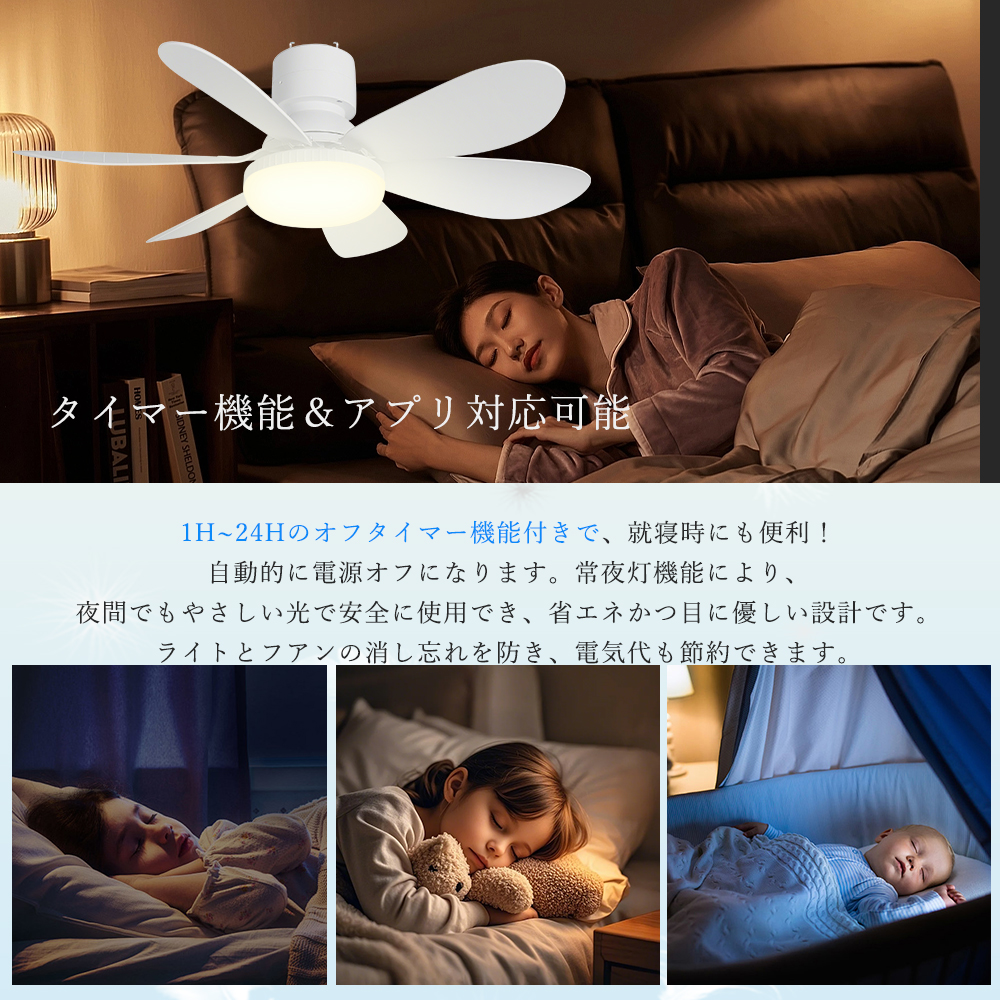 | ■【常夜灯・タイマー機能】 | LED天井ファンライトは常夜灯が付いており、一人寝て始めてのお子様の部屋また夜間授乳、お年寄りの看護などに最適です。 ライト・ファンそれぞれ独立運転可能で1H~24Hのタイマー機能を設定すると、自動的にシャットダウンできます。電気代も節約できます。 |