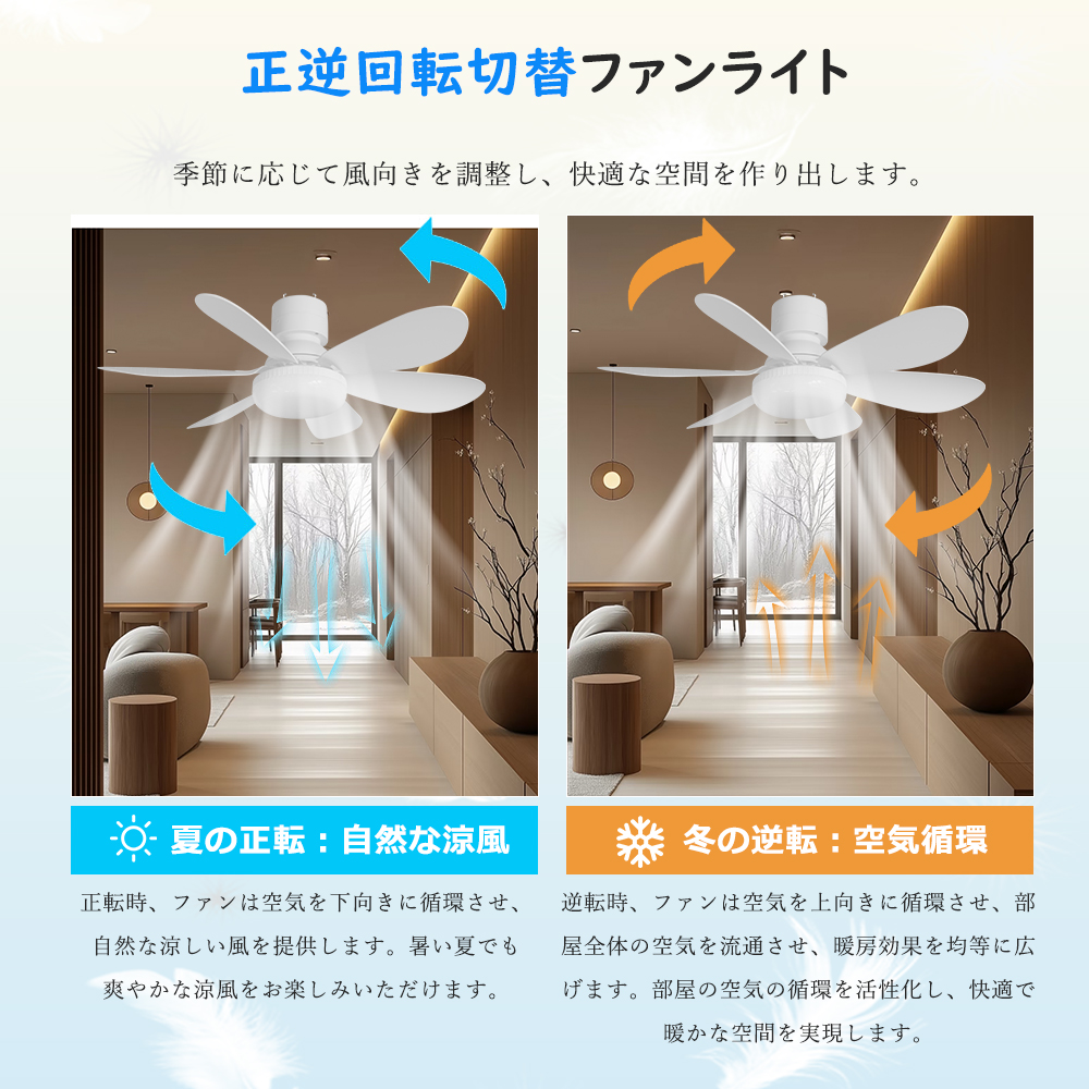| ■【正逆回転切替ファンライト】 | 節に応じて風向きを調整し、快適な空間を作り出します。 夏の正転:暑い夏でも爽やかな涼風をお楽しみいただけます。冬の逆転:空気循環、部屋の空気の循環を活性化し、快適で暖かな空間を実現します。 |