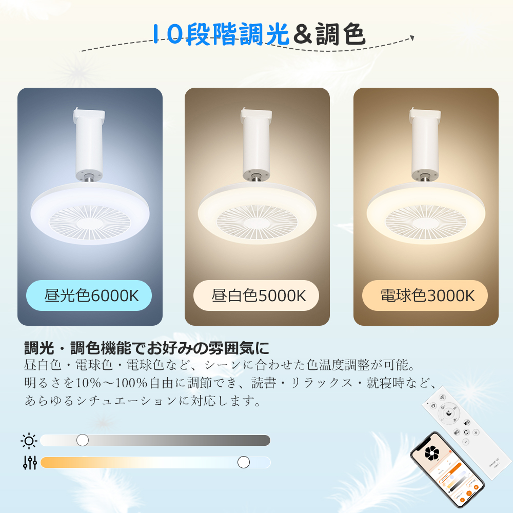 | ■【10段階調光&風量調節】 | スマホアプリ&リモコンで簡単に調光・調色可能。昼光色・昼白色・電球色の3色を10%〜100%まで無段階で切り替え。風量も自由に調節可能! |