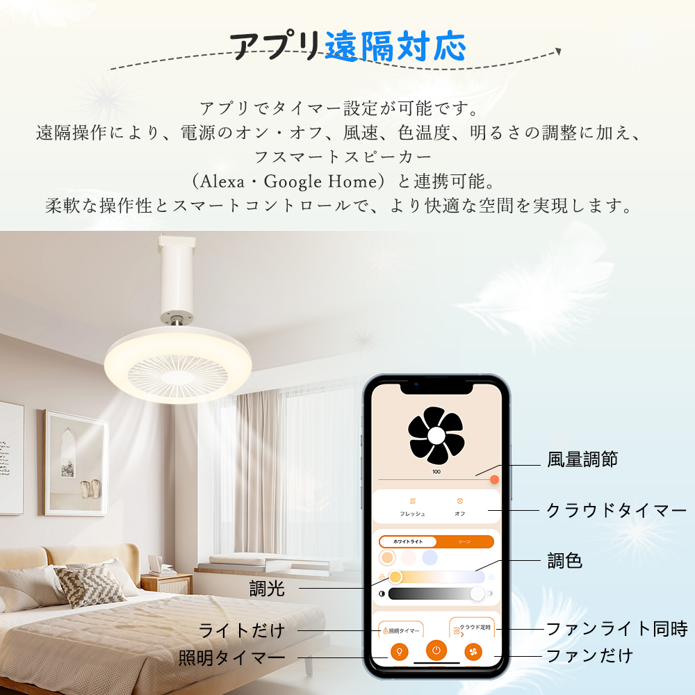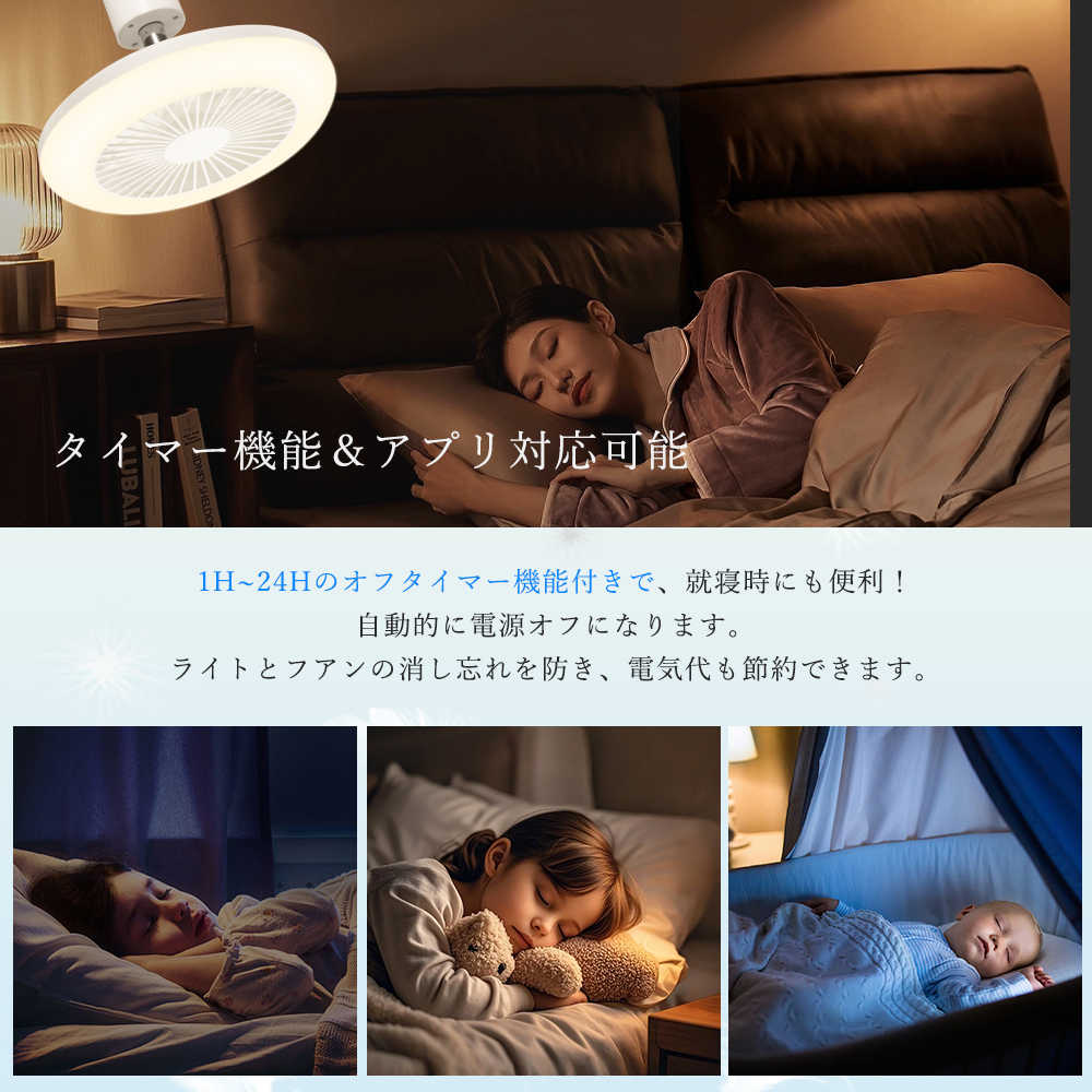 | ■【常夜灯・タイマー機能・音声アプリ対応】 | LED天井ファンライトは常夜灯が付いており、一人寝て始めてのお子様の部屋また夜間授乳、お年寄りの看護などに最適です。 ライト・ファンそれぞれ独立運転可能で1H~24Hのタイマー機能を設定すると、自動的にシャットダウンできます。電気代も節約できます。 スマートスピーカーと連携可能。音声で照明やファンのオン・オフ、調光・風量調節などが簡単に操作できます。 |