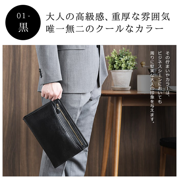 | 大人のお洒落を演出した牛革製セカンドバッグ。普段使いからフォーマルまで幅広く活躍。 |