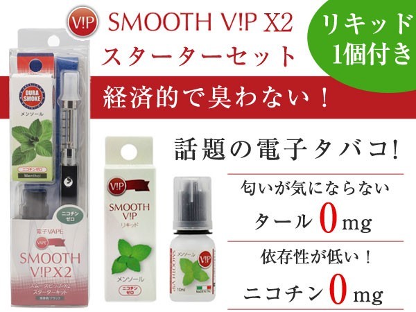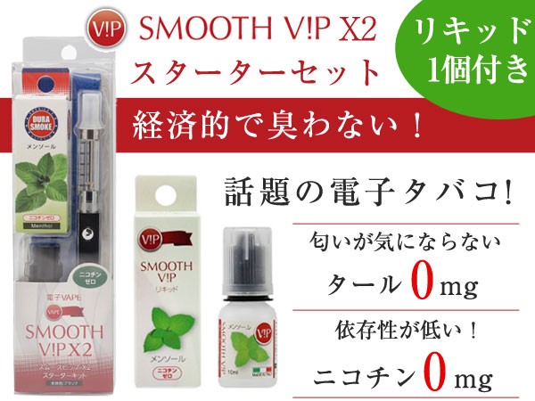 | 付属品 | 本体(アトマイザー/バッテリー) シリコンキャップ USB充電器 日本語取扱説明書兼保証書 デュラスモークVAPERリキッド 10ml(メンソール) ※付属の初期リキッドはアメリカ製になります。 SMOOTH VIP専用ケース |