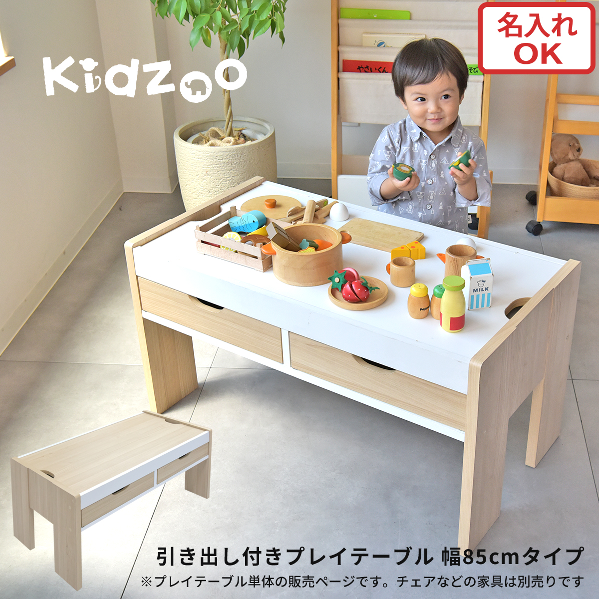 収納付きプレイテーブル(幅85cm)なら、遊ぶ→片付けるまでがこの場で完結。