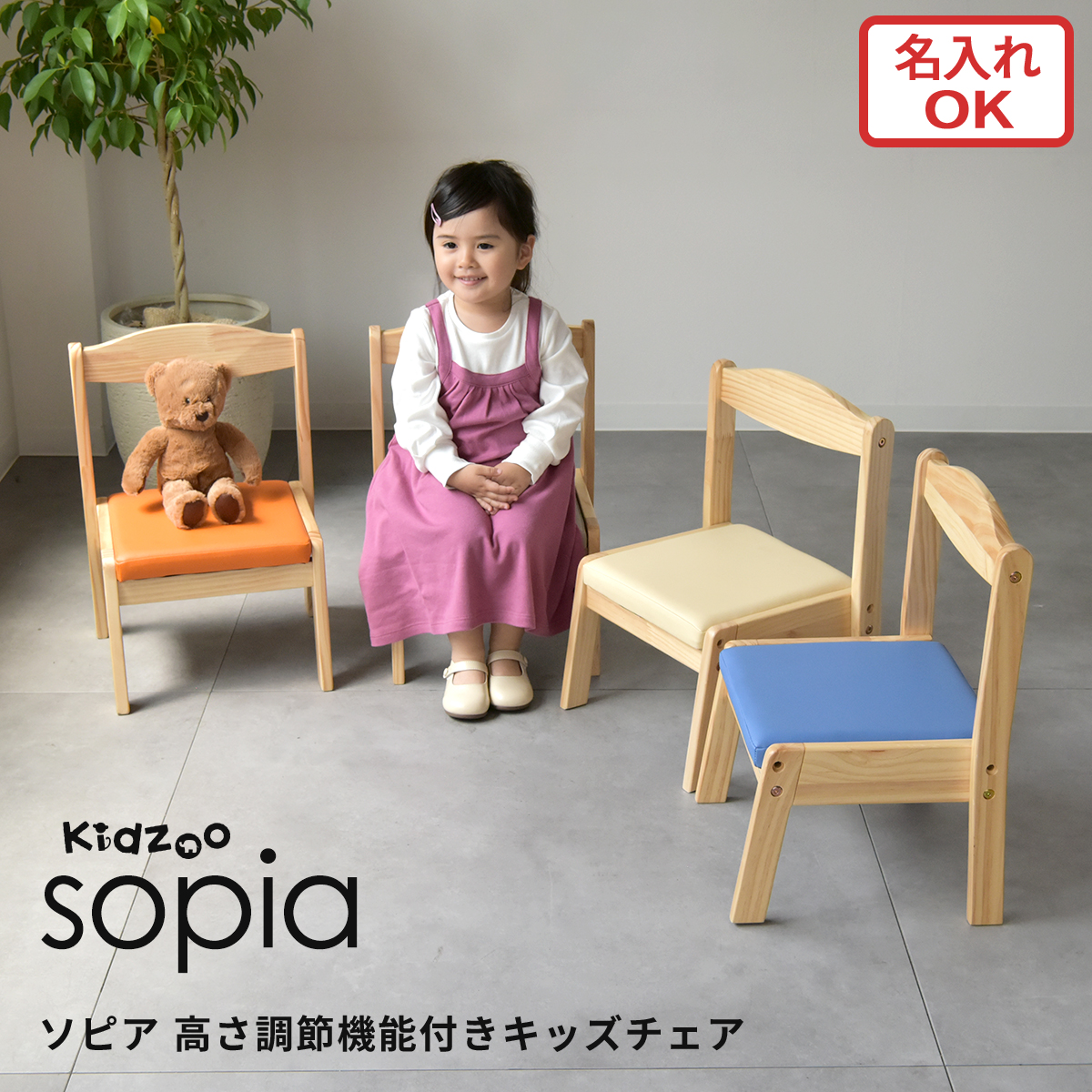 検索語:KNN-C ソピア キッズチェア 高さ調節 ローチェア 木製 スタッキング 有料名入れプレート対応 Kidzoo キッズー