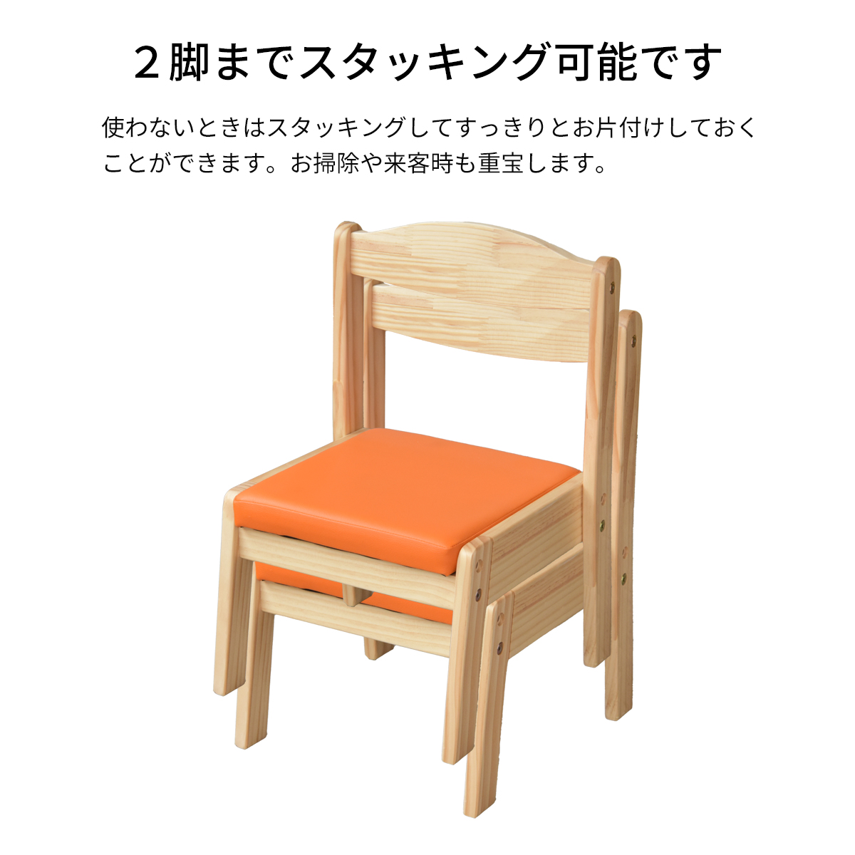 座面の高さを2段階で調節でき、成長に合わせて使えます。スタッキングもできるので、使わない時は省スペースに収納できます。