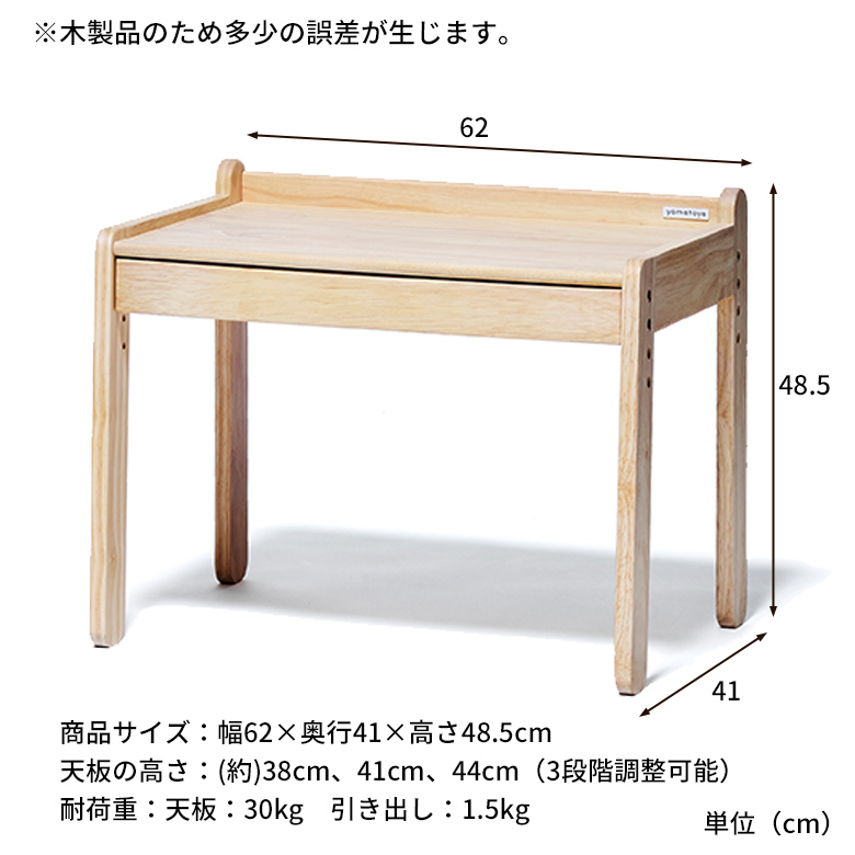 サイズ:デスク(約)幅62×奥行き41×高さ48.5cm/天板高さ(約)38cm・41cm・44cm、チェア(約)幅34.5×奥行き31.5×高さ45cm/座面高さ(約)18.5cm・21.5cm・24.5cm