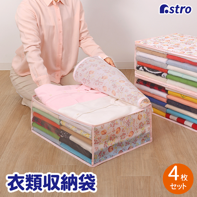 衣類収納ケース チューリップ柄 4個組 通気性の良い不織布製 収納袋 衣装ケース 洋服 収納ボックス 防塵 透明窓付き 折りたたみ レトロ 花柄 アストロ 168-01