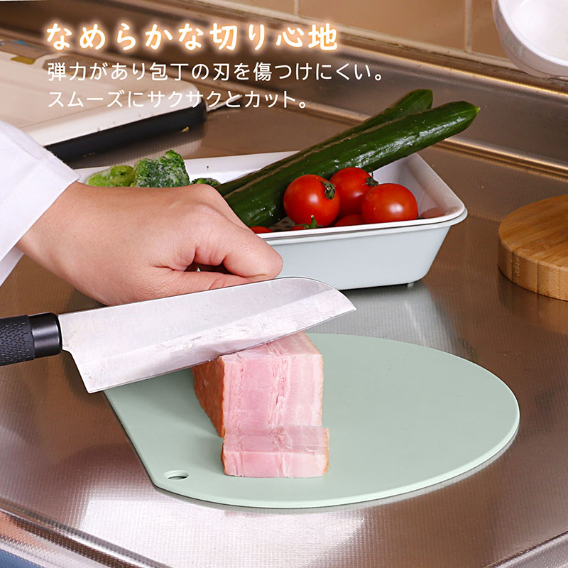 ●ゴムのような素地でなめらかな切り心地の使いやすいサイズの抗菌まな板。
