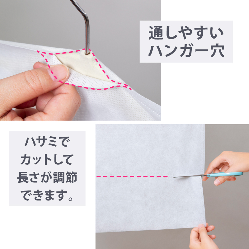●1枚ずつカバーを被せておくことで保管中に洋服同士が擦れず、毛玉や生地の傷みなどのダメージ防止にも。