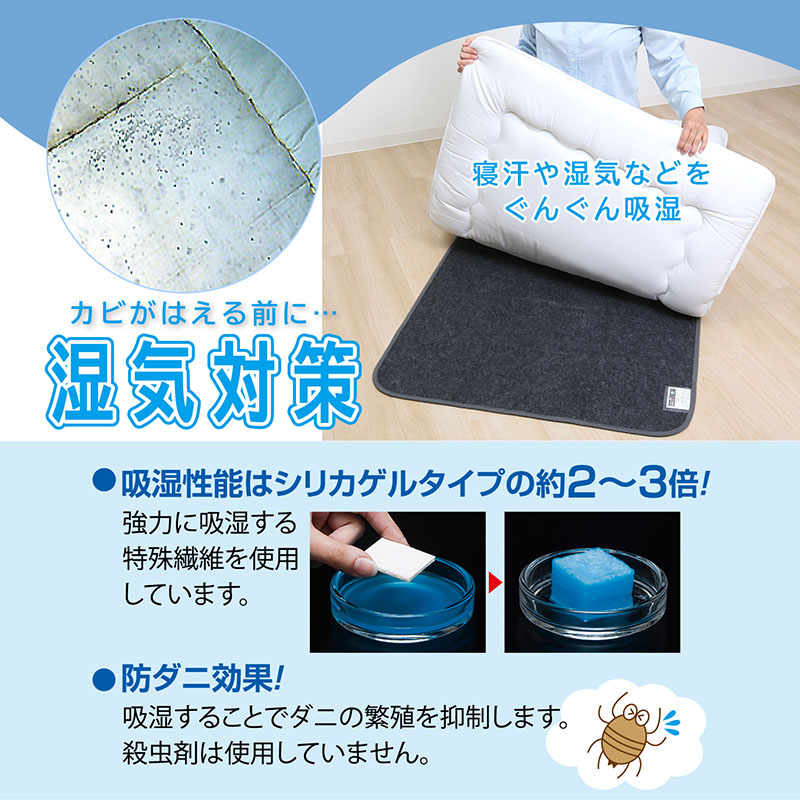 ●シリカゲルの約2〜3倍の吸湿性がある繊維と活性炭を使用。吸湿することでダニの発生を抑制。