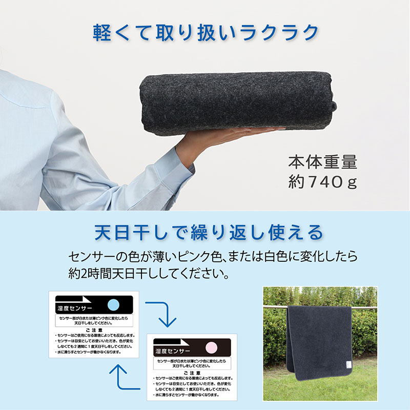 ●干し時が一目で分かる湿度センサー付き。吸湿しても天日干しで吸湿性能が回復し繰り返し使える。