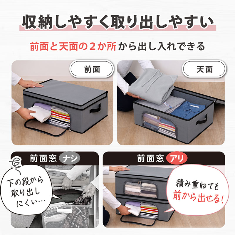 ●上面と前面の2か所から出し入れでき、積み重ねたままでも取り出せる。