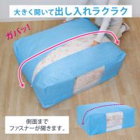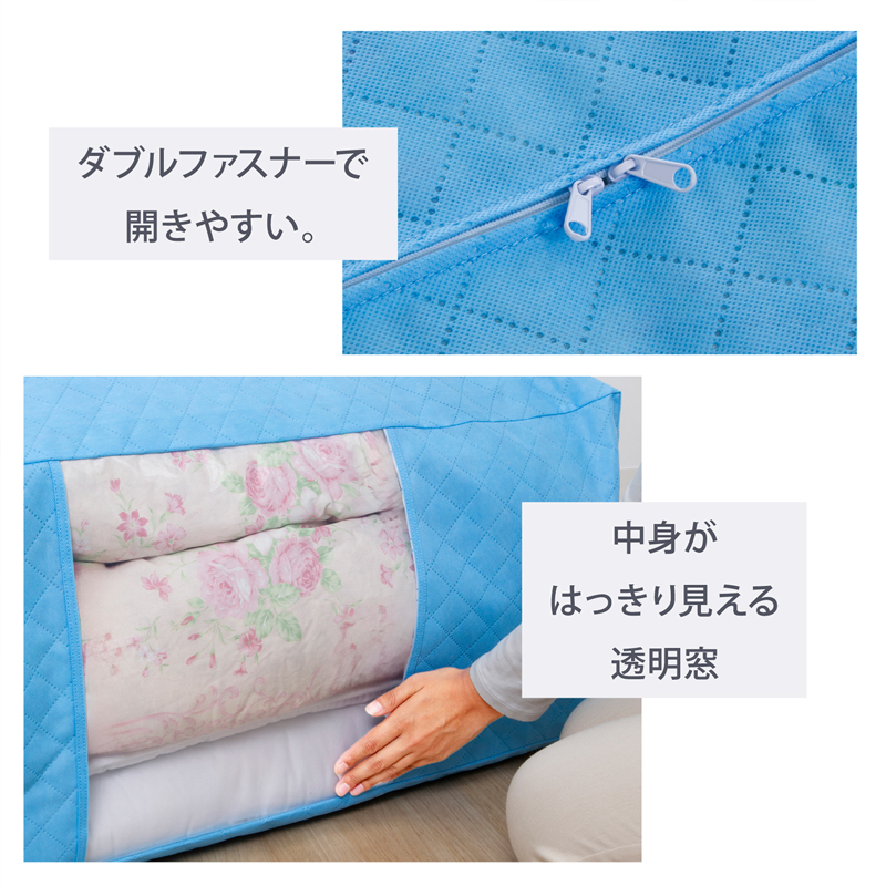 ●透明窓で収納したまま中身の確認が可能。ダブルジップファスナーで3辺が開くので衣類の出し入れがスムーズ。