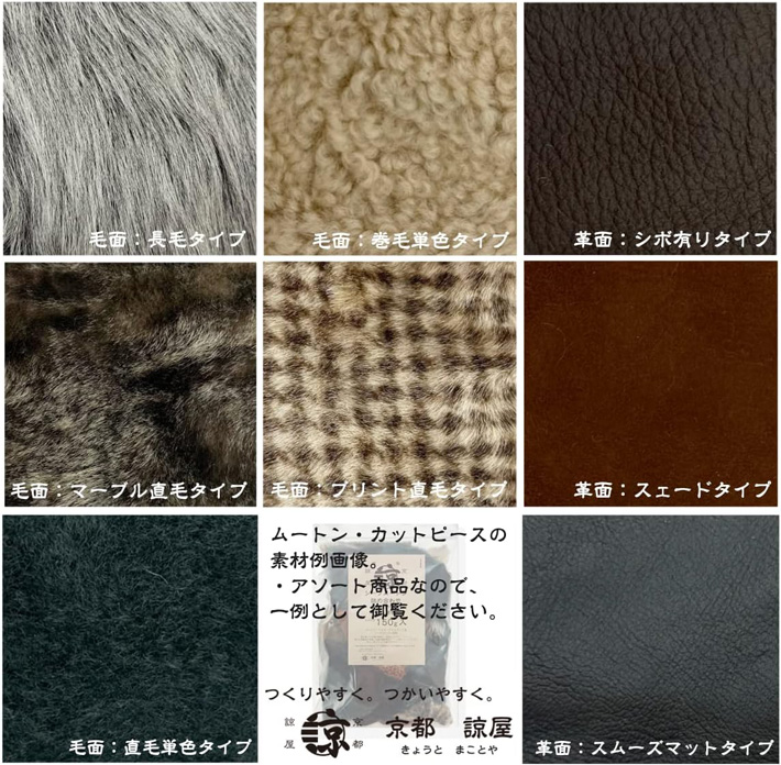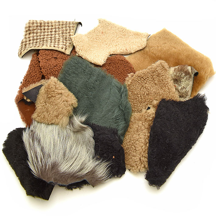ヨーロッパ産の高品質な衣料用ムートンのカットピースを150gのパックになるように詰め合わせました。衣料用ムートンなので、針通りが良く、加工・作品作りがしやすいカットピースです。革小物作品の装飾に使うことができます。様々な色、柄が入った大変お得な詰め合わせです。
