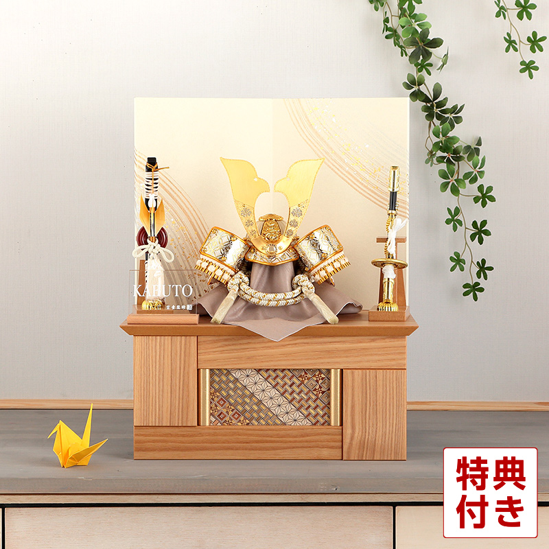 左右には色味を揃えた弓太刀飾り、シケ引デザインの屏風など、細部までこだわりの感じられる一式です。 サイズ:間口35×奥行28×高さ43(cm)
