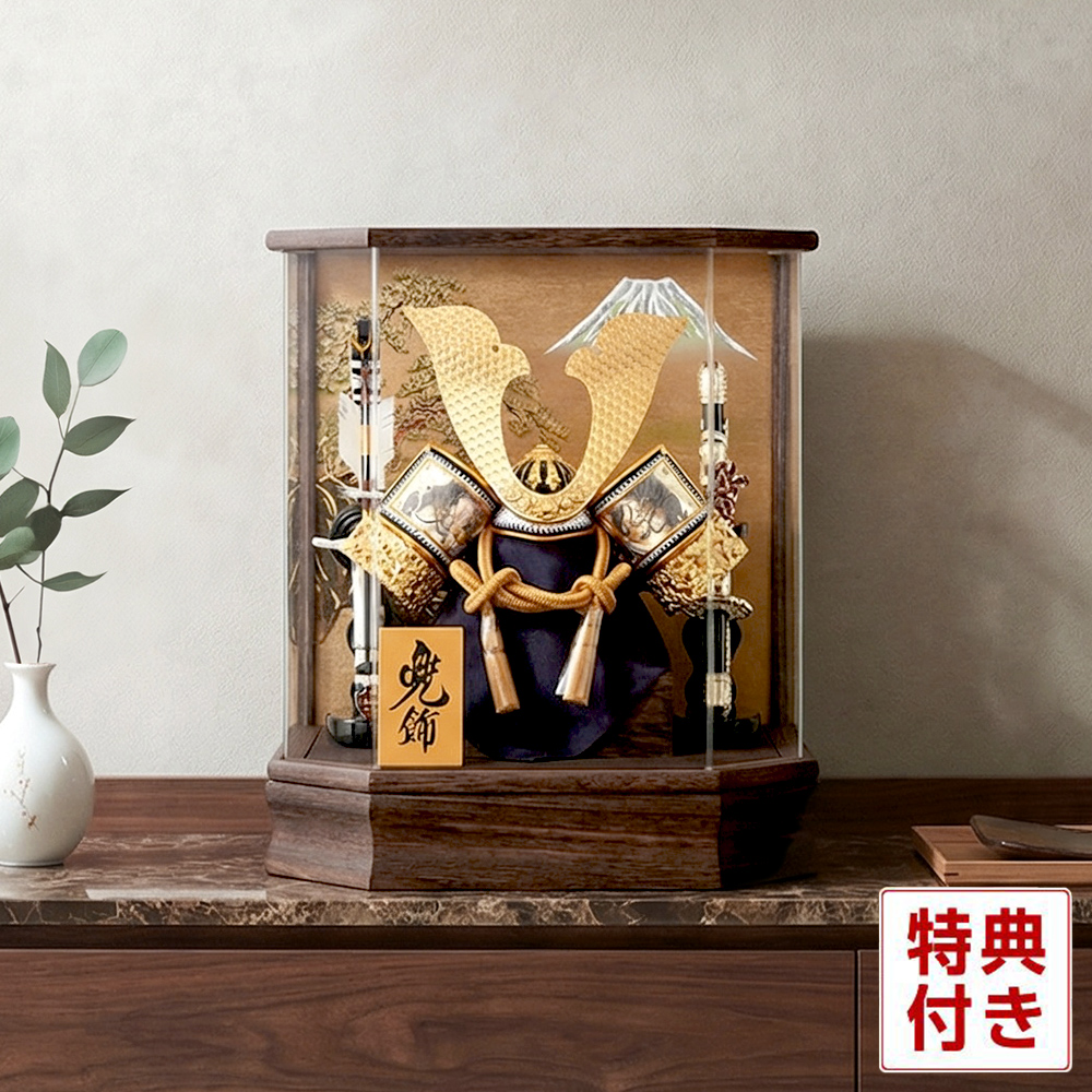 | 2026年度新作再入荷 特選限定品 オリジナルモデル 焼桐の風合いがシックなケース飾りのご紹介です。 金色の大鍬形と背面に描かれた富士の存在感が相まって、存在感は抜群。 金小札を生命力の象徴ともいえる赤糸の縅(おどし)で仕上げました。 また、兜の吹返しには勇ましい龍の彫金が施されており見応えも十分ですね。 六面のアクリルケースはどの角度からも見えやすく、飾る場所を選びません。 たいへんコンパクトなサイズでありながらも飾り映えする一品です。 ケース飾りは大切な兜を埃や汚れから守ってくれますので、お手入れ、お片付けも簡単です。 サイズ:間口36.5×奥行29×高さ41.5(cm) 端午の節句は菖蒲の節句とも呼ばれ、鎧・兜・刀・武者人形や金太郎を模した五月人形を室内に飾り、庭前にこいのぼりを立てて男の子の成長を祝い、健康と立身出世を祈るお節句です。 手作り品につき、弓・太刀などの仕様が変更になる場合がございますので、あらかじめご了承ください。 昨年度好評につき、兜・弓太刀・立札・ケース背景・セット内容などの仕様を一部変更して再生産が決定いたしました。2026年度4月再入荷モデルは、お客様への販売価格を抑えるため、製造元からの直接仕入をすることで、この品質でありながらお求めやすい価格が実現しました。 |