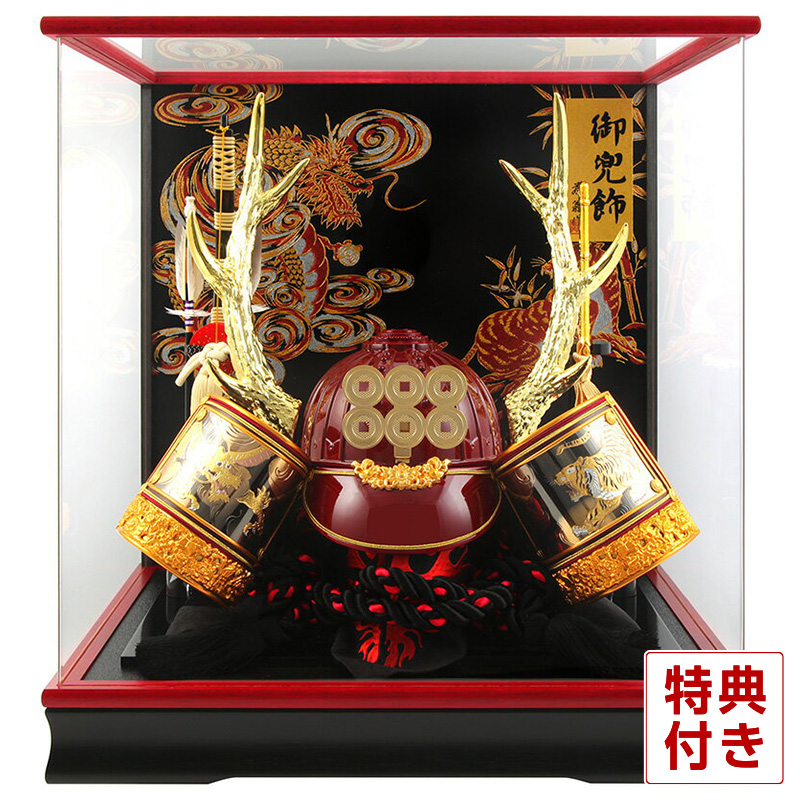 雄々しく睨み合う龍虎がデザインされた吹返しやケース背景は、勇ましさを象徴する兜をより一層引き立てますね。