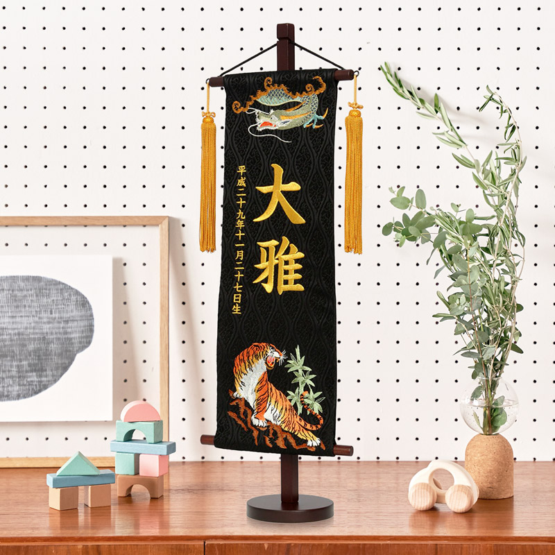 2026年度新作 名前旗 五月人形 平安義正作 名物裂 京都 西陣 織物 (黒) 刺繍柄龍虎 誕生日刺繍 特中 飾り台付 名前・生年月日入れ代金込み h295-mkcp-173765 |