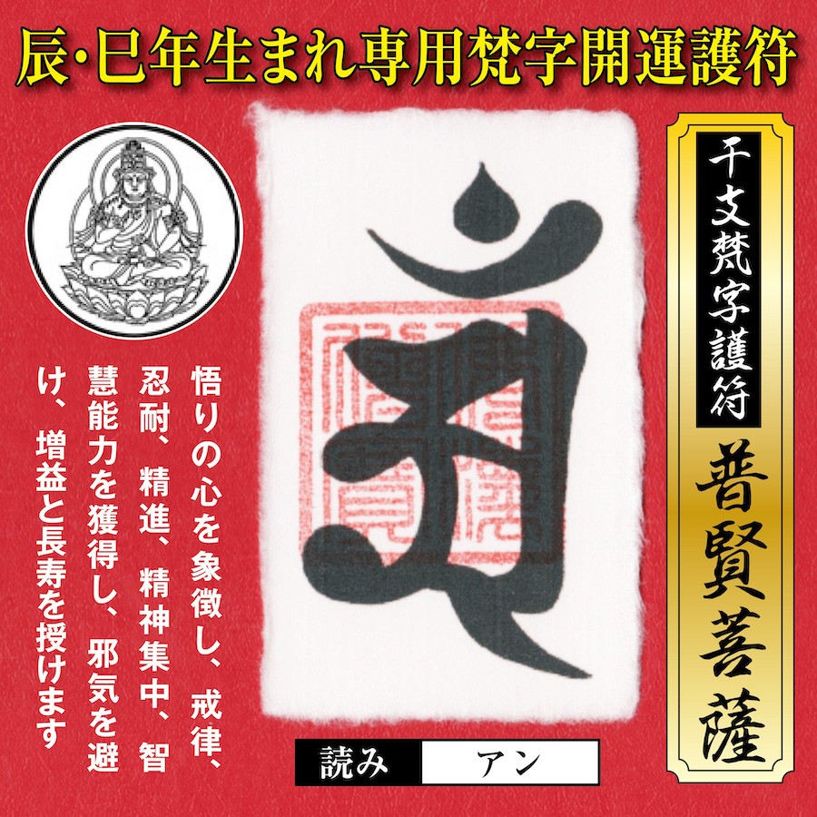 この護符を辰年(たつ年)巳年(み年・へび年)の人が持つことで、守護本尊(守り本尊)様のご加護により、金運や財運、恋愛運や健康運、仕事運や人気運などのあらゆる運が劇的にアップし、何事も好調に転じる万能の梵字開運護符です。