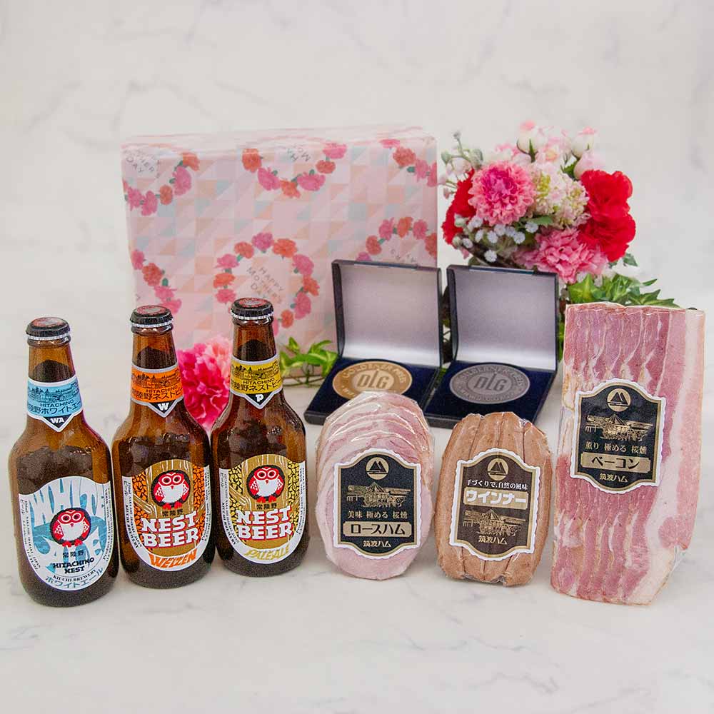 | セット内容 | ロースハムスライス70g ベーコンスライス120g ウインナー100g 常陸野ネストビール330ml (ペールエール・ホワイトエール・ヴァイツェン) 母の日ギフト包装 ※各商品重量は手作りなために、多少ばらつきがあります。セット内で価格調整をさせていただきます。 |