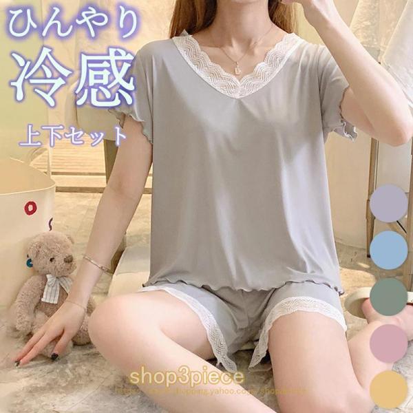 クール アイスシルク ルームウェア 上下セット レディース 接触冷感 半袖 無地 Vネック レース パジャマ セットアップ ナイトウェア 部屋着