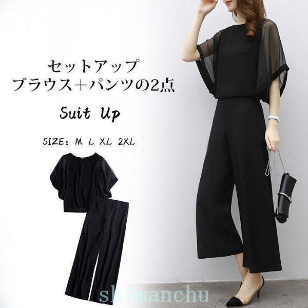 セットアップワイドパンツレディースきれいめ2点セットスシフォンブラウスフリルゆったり体型カバーフォーマル二次会30代40代入学式入園式