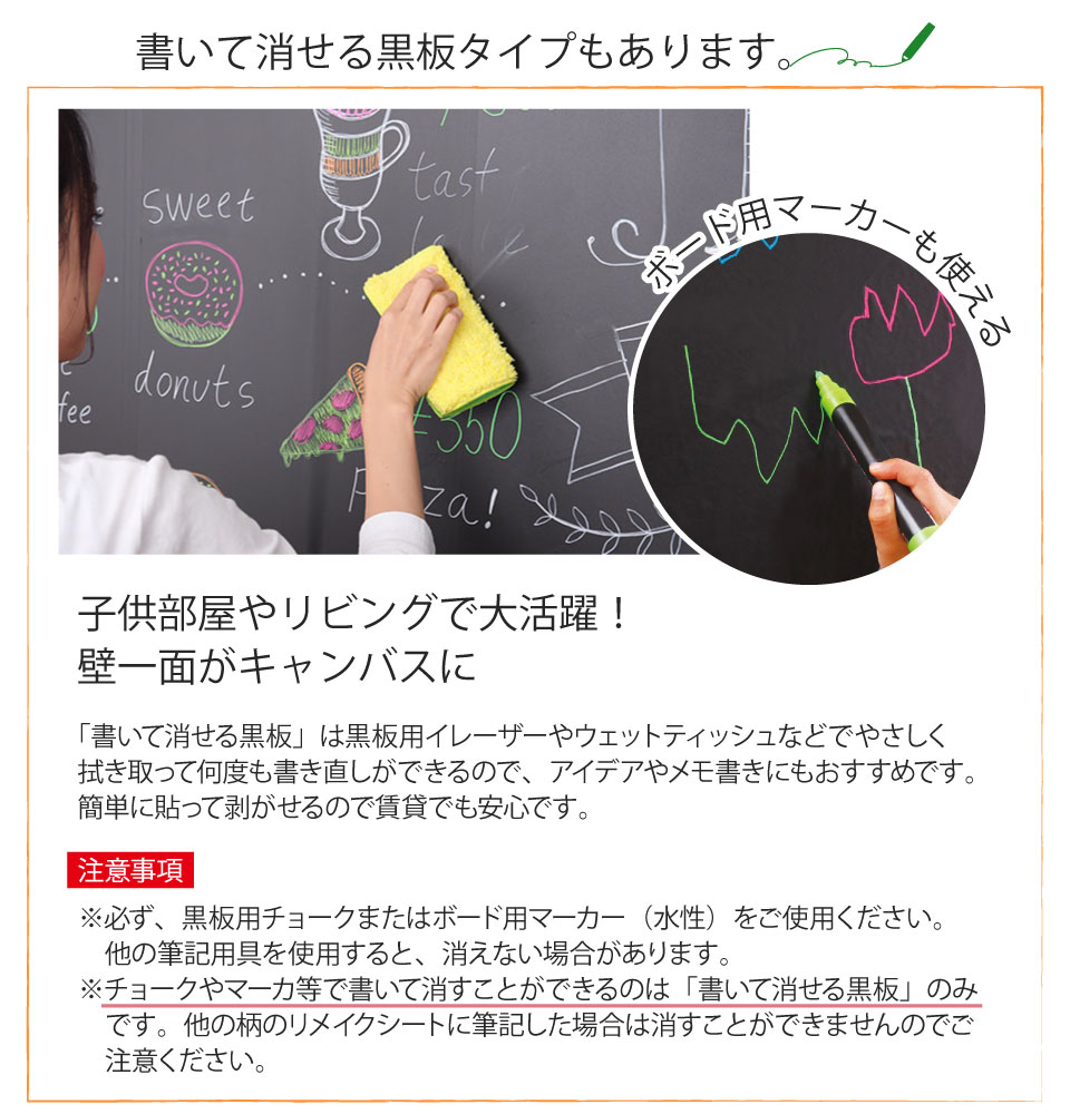※チョークやマーカ等で書いて消すことができるのは「書いて消せる黒板」のみです。他の柄のリメイクシートに筆記した場合は消すことができませんのでご注意ください。