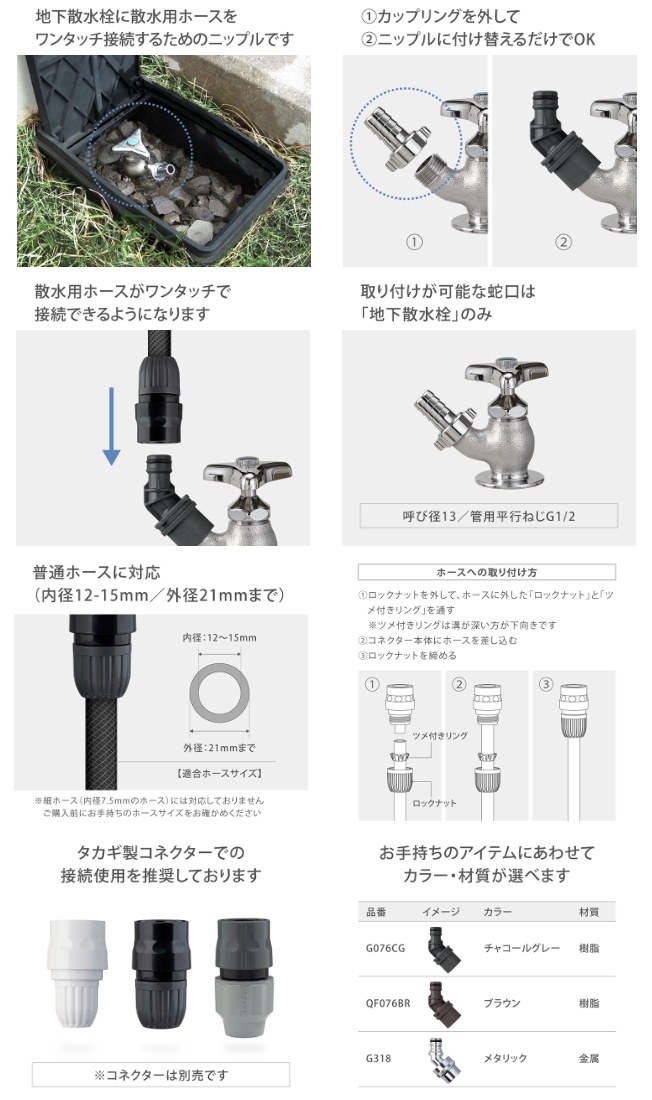 ・地下散水栓蛇口に取り付けて、コネクター(別売り)付きホースの取り外しがワンタッチで接続可能です。