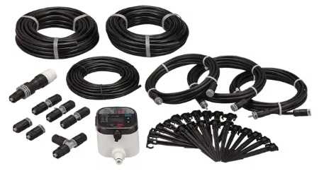 ・蛇口に取り付けて時間設定など簡単な操作をするだけで自動で水やりできるタイマーと、花壇や家庭菜園などに最適なアイテムを揃えたスターターキット。タイマーは乾電池式のためコンセントがなくても使用可能です。