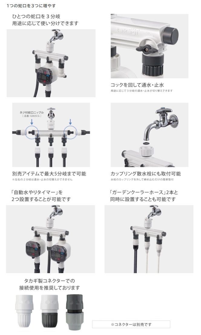 ・ひとつの蛇口を3分岐、用途に応じて使い分けできます。