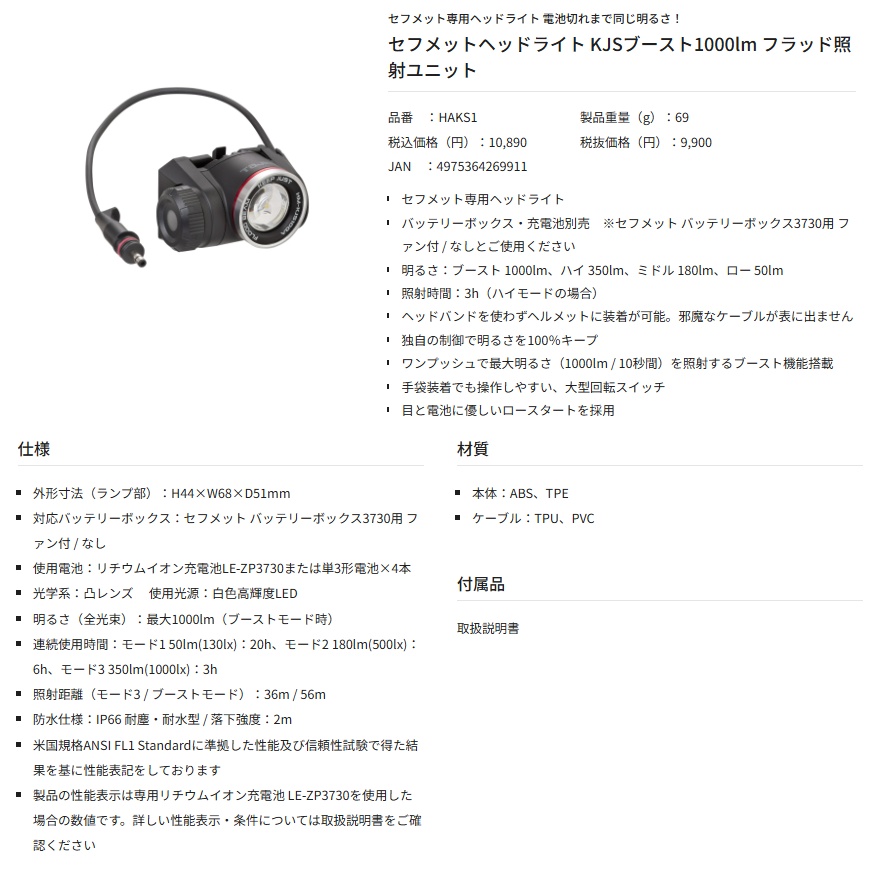 タジマ HAKS1 セフメットヘッドライト KJSブースト1000lm フラッド照射ユニット TJMデザイン TAJIMA 269911 '