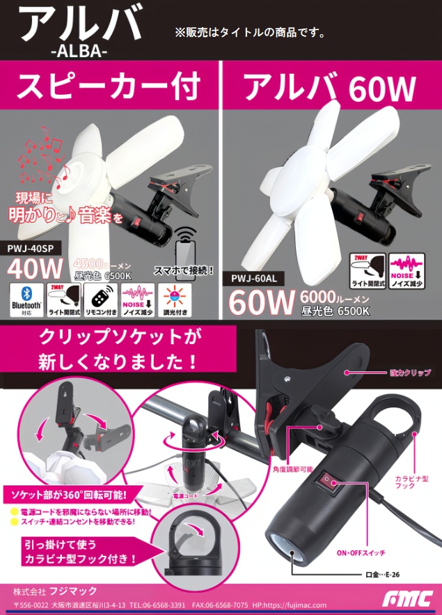 フジマック ALBA PWJ-40SP 開閉式LEDライト スピーカー付 40W 本体 クリップライト アルバ MACH 703174 '