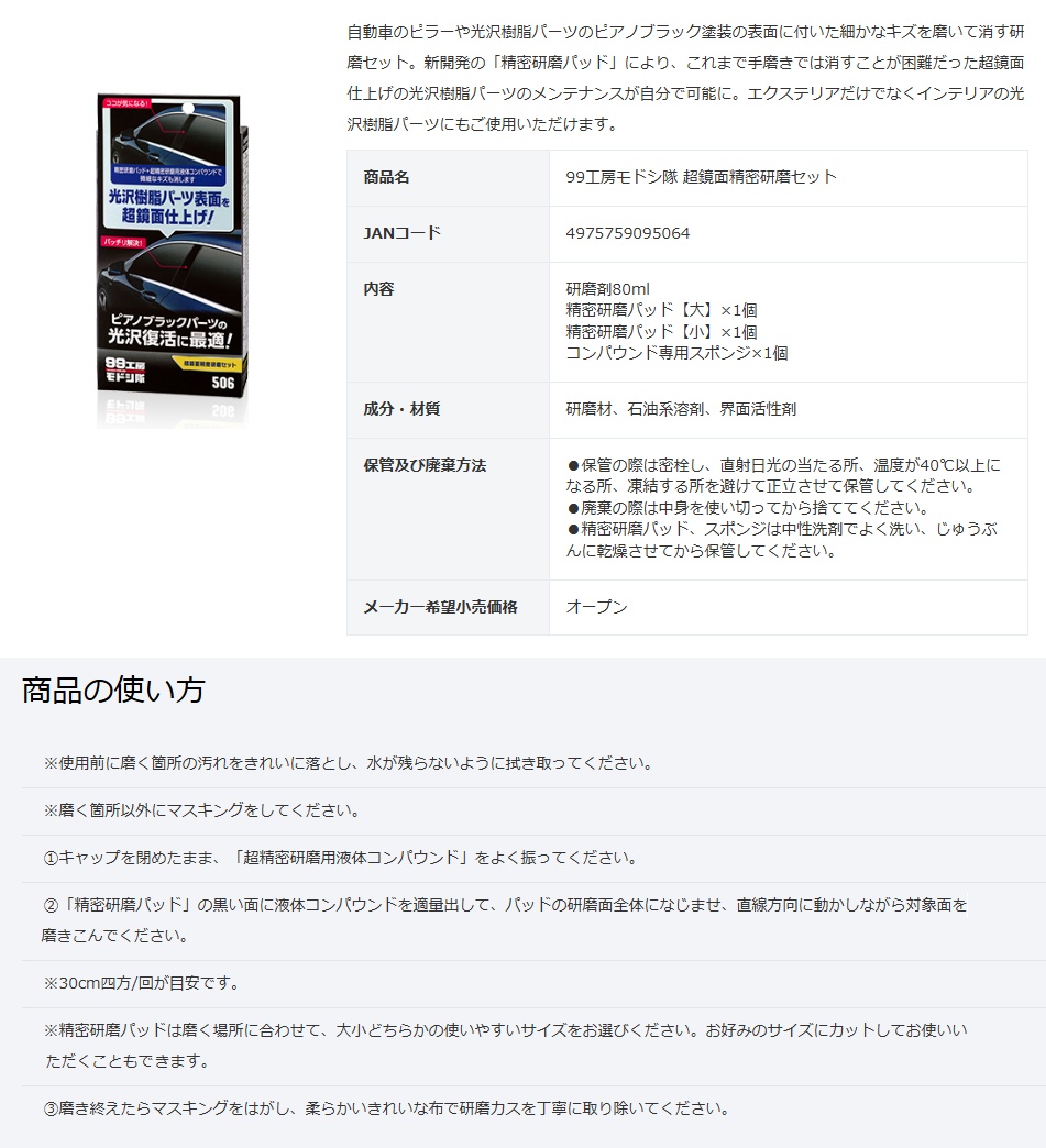ソフト99 99工房モドシ隊 超鏡面精密研磨セット 商品コード09506 自動車用光沢樹脂パーツ及び塗装面の鏡面研磨用 SOFT99 小型便 在庫
