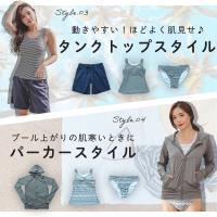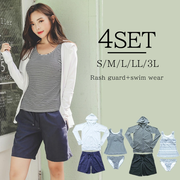 水着 体型カバー レディース タンキニ ラッシュガード ボーダー トップス 可愛い ショートパンツ 上下4点セット 長袖 指穴付き