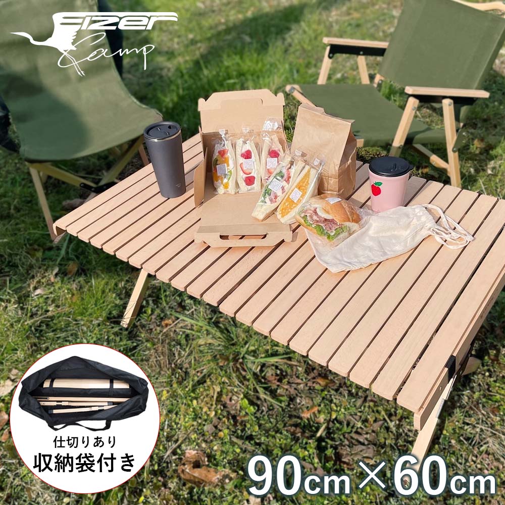 ウッドロールトップテーブル 収納袋付き 天然木 ウッドテーブル アウトドア 幅90cm 木製 テーブル 折りたたみ キャンプ アウトレット 訳あり