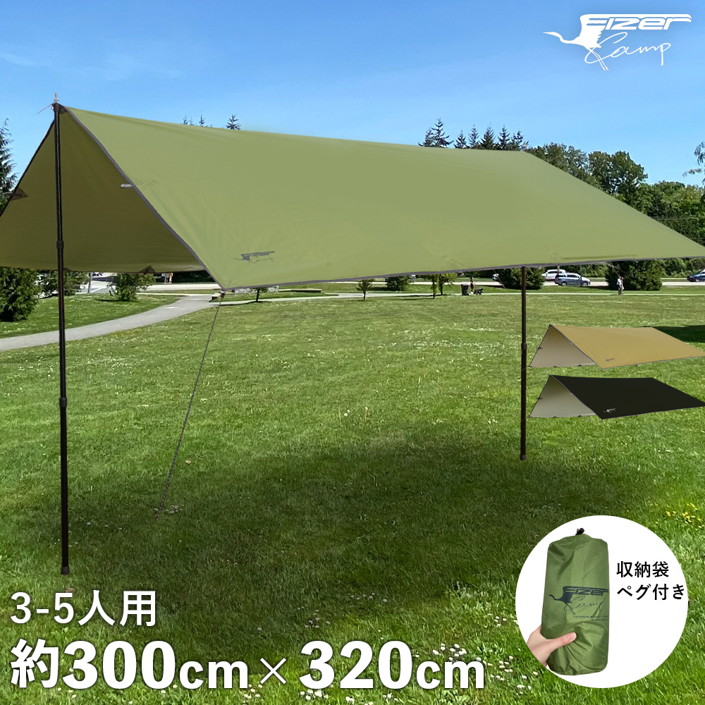 タープ タープテント 3m 300 防水 おしゃれ スクエア キャンプ 丈夫 黒 グリーンカーキ 超軽量 3~5人用 3×3 リップストップ生地 収納袋