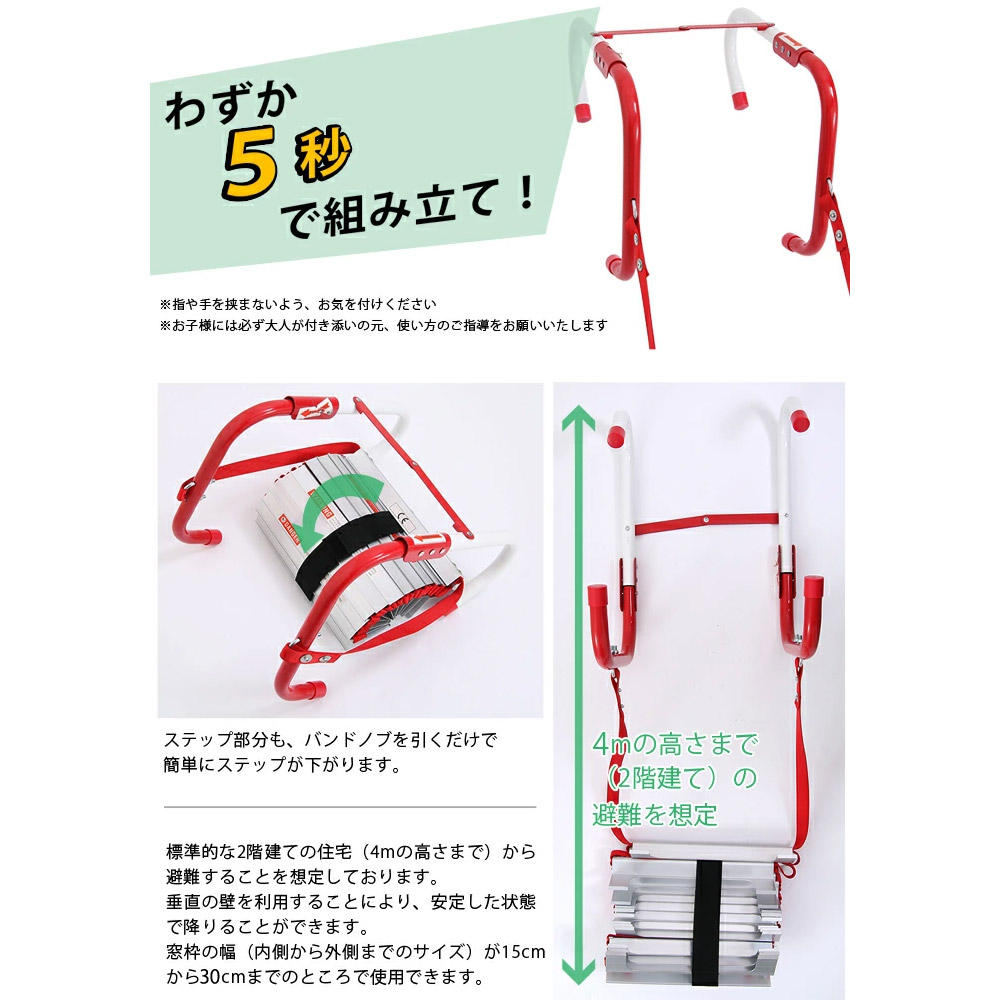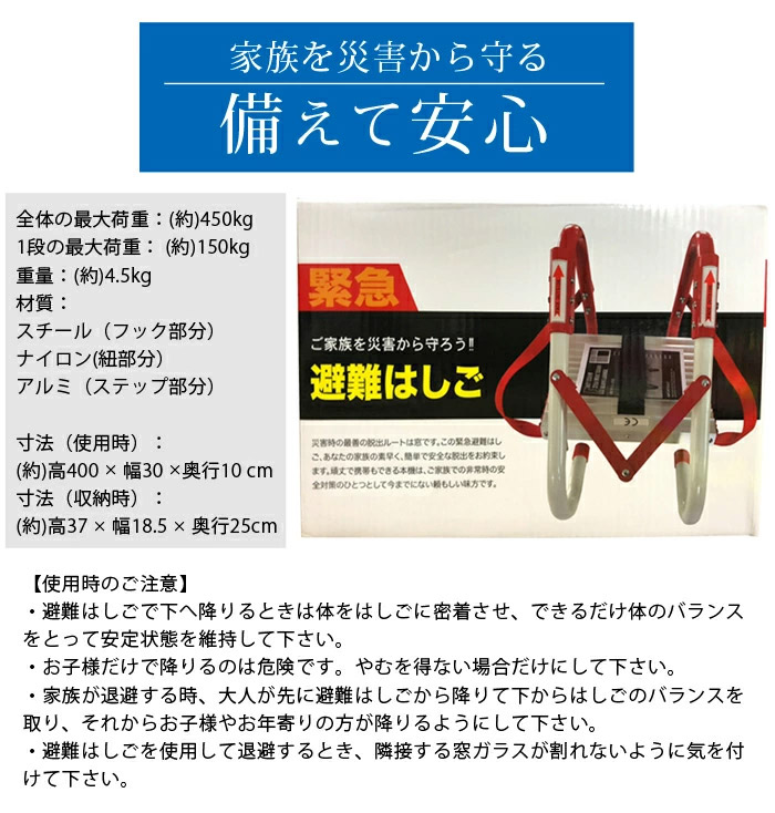 あくまでも一般家庭向けの緊急避難用はしごです。耐荷重・安全性を考慮して設計されており、