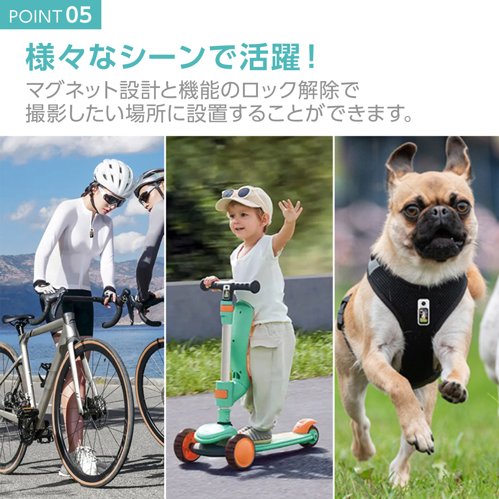 両手を使わず、自転車やアウトドア、作業中の記録を
