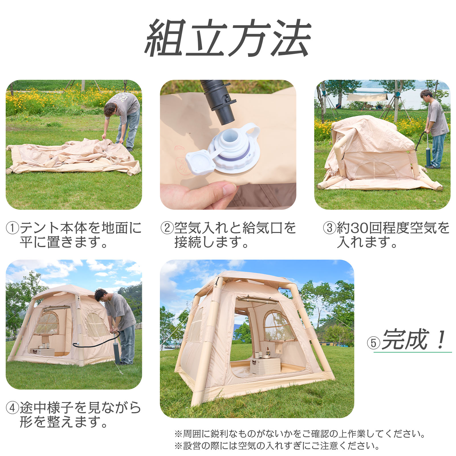 付属の空気入れで約30回押すだけで設営可能。