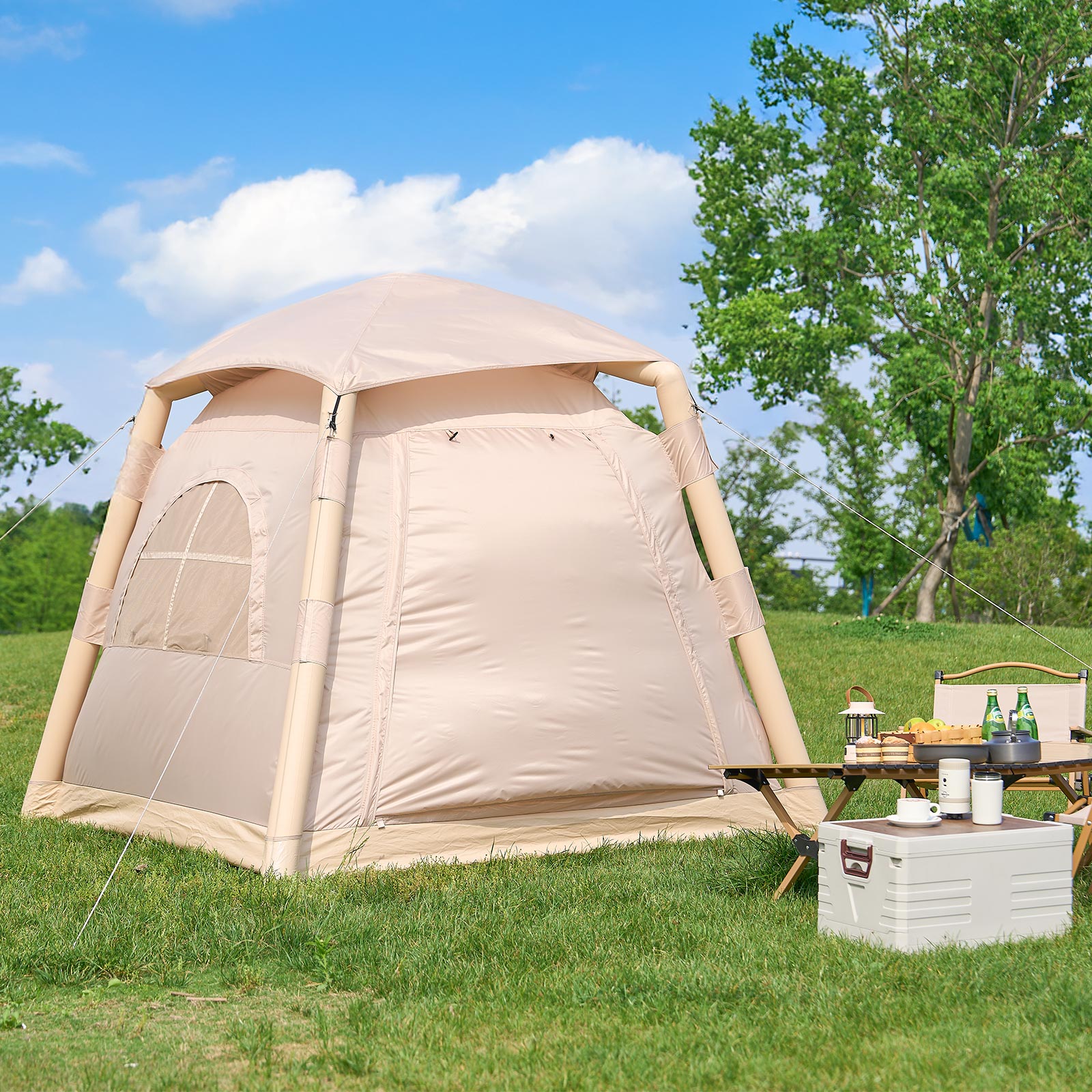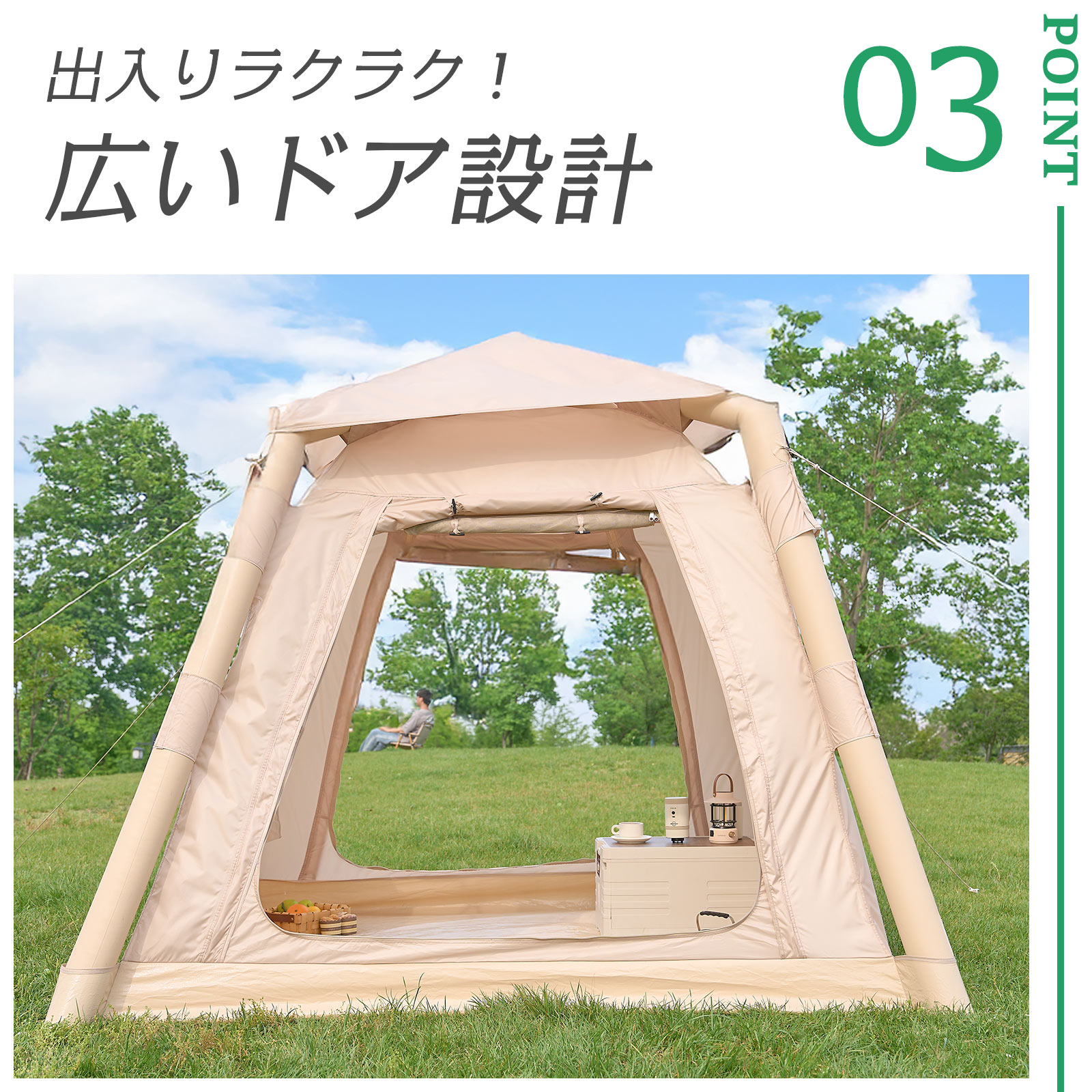 空気を入れるだけで簡単に設営できる、インフレータブル式エアーテントです。